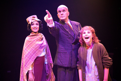 George Dvorsky as Oliver "Daddy" Warbucks with Corinne Tork as Grace Farrell, and Annabel Feigen as Annie. Photo Credit: Sarah Kozma